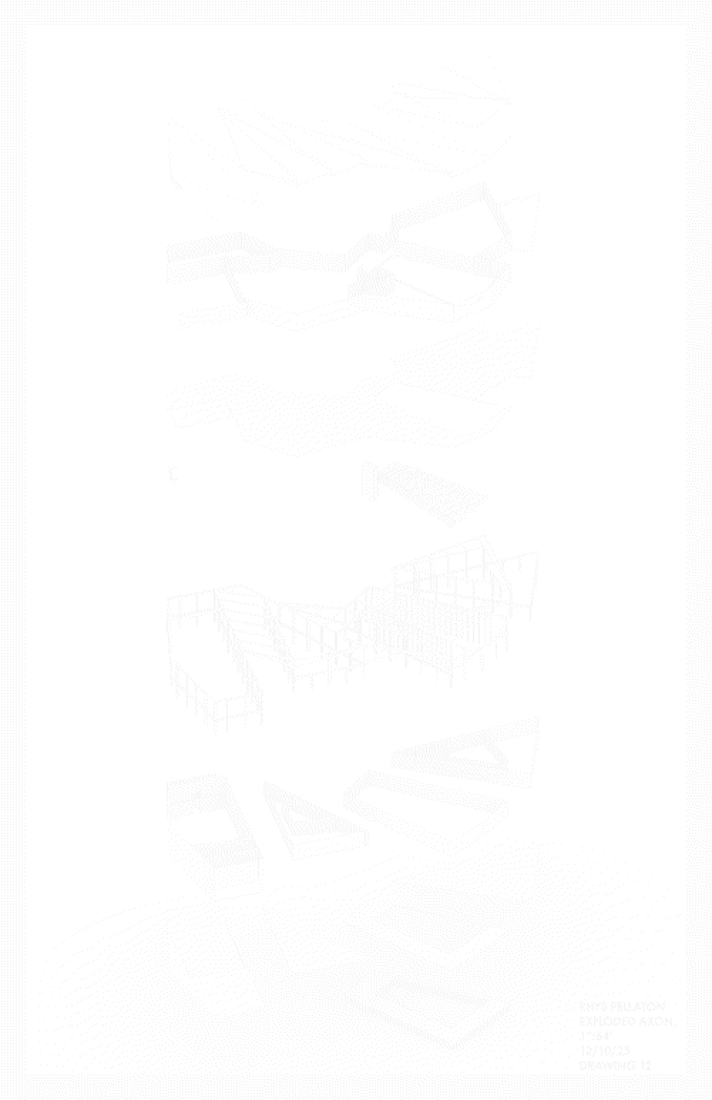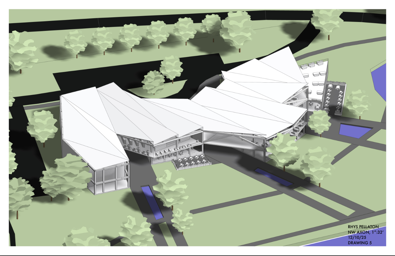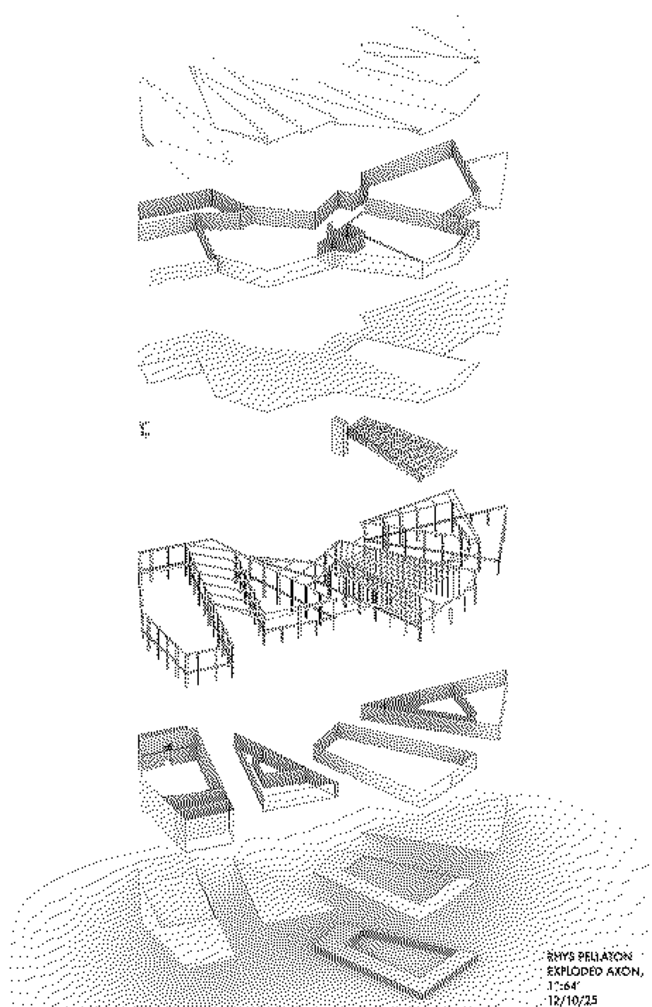 The tunnels between each node of the center offer sightlines to the inlet and beyond, with the building becoming a doorway rather than an obstruction. Entrances near the western sides of each tunnel offer different opportunities: a bistro, a café, a theater, and the library. Large step-seats in the library bridge the ground floor public spaces with the upper library sanctum, and the space beneath the seats creates space and focus for a gallery. By bringing together major community attractions, I hope to bring excitement to the Cayuga waterfront through desirable third spaces.